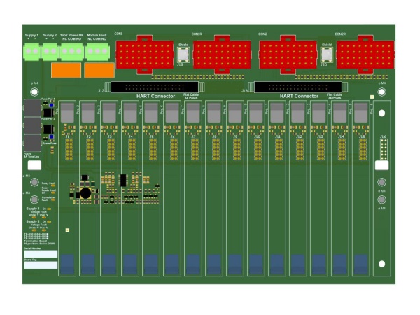 This Termination Board (TB) provides direct connection between the I/O Card of the system and D5000 / D6000 Series modules. Intrinsically Safe protection and signal isolation between Safe and Hazardous Area are provided by D5000 Series Associated Apparatus. 24 Vdc Power Supply of the TB is connected to two plug-in terminal blocks, for a redundant power supply. Modules are supplied via TB power bus.