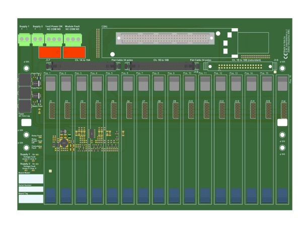 This Termination Board (TB) provides direct connection between the I/O Card of the system and D5000 / D6000 Series modules. The Intrinsically Safe protection and signal isolation between Safe and Hazardous Area, is provided by D5000 Series Associated Apparatus. The 24 Vdc Power Supply of the TB is connected to two plug-in terminal blocks, for a redundant power supply. The power supply for modules is given by TB power bus.