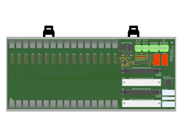 This Termination Board (TB) provides direct connection between the I/O Card of the system and D5000 / D6000 Series modules. The Intrinsically Safe protection and signal isolation between Safe and Hazardous Area, is provided by D5000 Series Associated Apparatus. The 24 Vdc Power Supply of the TB is connected to two plug-in terminal blocks, for a redundant power supply. The power supply for modules is given by TB power bus.