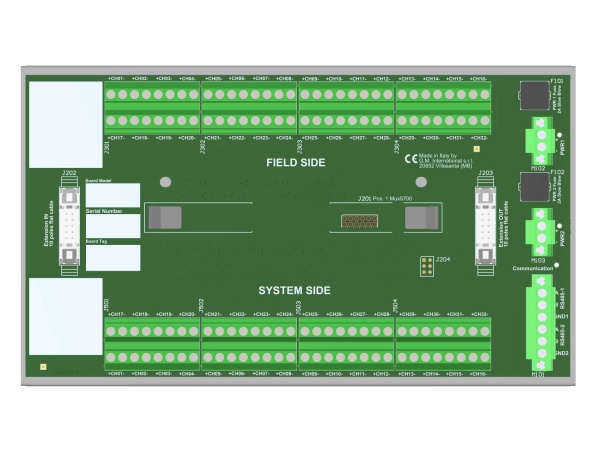 This Termination Board with Enclosure (TBE) allows the remote monitoring of any HART®-compatible 4/20 mA field loop. This is obtained by one locally mounted HART® Multiplexer Modem 5700 series and terminal block interface connectors to access the relevant loops. The board is installed in series to the loops and is totally transparent to both transmitter and receiver. This model is suitable for interfacing AI cards of safety PLCs with typical input impedance of 250 Ω and AO cards. The single TBE-D5001-HRT-004 Termination Board supports 32 channels. Yet, it could be extended with additional units (up to 8) to manage all 256 channels available on the HART® Multiplexer Modem 5700 series. The Mux unit connects, via the RS-485 interface, to an external PC running an FDT-based software package (PACTware™, etc...) through a dedicated Device Type Manager (DTM). The PC can communicate with multiple Mux units, located on different boards, in a multi-drop RS-485 mode. The HART® Termination Board TBE-D5001-HRT-004 is SIL 3 certified as non-interfering with the signal loops. The 24 Vdc Power Supply of the TBE is connected to two plug-in terminal blocks, for a redundant power supply.
