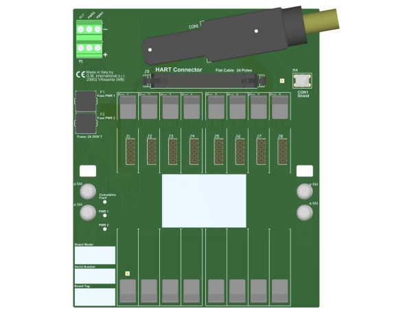 This Termination Board (TB) provides direct connection between the I/O Card of the system and D5000 / D6000 Series modules. The Intrinsically Safe protection and signal isolation between Safe and Hazardous Area, is provided by D5000 Series Associated Apparatus. The 24 Vdc Power Supply of the TB is connected to two plug-in terminal blocks, for a redundant power supply. The power supply for modules is given by TB power bus.