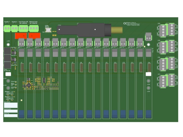 This Termination Board (TB) provides direct connection between the I/O Card of the system and D5000 Series modules. The Intrinsically Safe protection and signal isolation between Safe and Hazardous Area, is provided by D5000 Series Associated Apparatus. The 24 Vdc Power Supply of the TB is connected to two plug-in terminal blocks, for a redundant power supply. The power supply for modules is given by TB power bus. The TB-D5016-INV-003-2 adds to the TB-D5016-INV-003 the possibility of disconnecting individually each actuator and the capability of switching off the actuators through a safety PLC.
