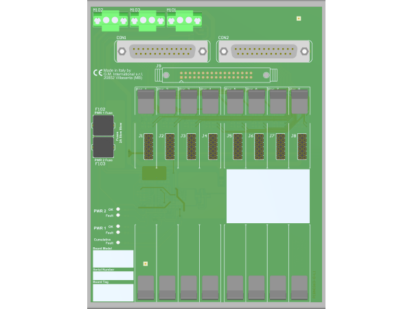 This Termination Board with Enclosure (TBE) provides terminals for the direct connection between the I/O Card of the system and D5000 / D6000 Series modules. The Intrinsically Safe protection and signal isolation between Safe and Hazardous Area, is provided by D5000 Series Associated Apparatus. The 24 Vdc Power Supply of the TBE is connected to two plug-in terminal blocks, for a redundant power supply.