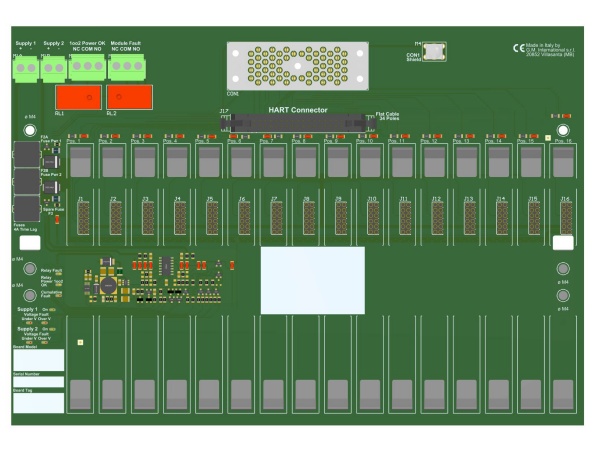 This Termination Board (TB) provides direct connection between the I/O Card of the system and D5000 / D6000 Series modules. The Intrinsically Safe protection and signal isolation between Safe and Hazardous Area, is provided by D5000 Series Associated Apparatus. The 24 Vdc Power Supply of the TB is connected to two plug-in terminal blocks, for a redundant power supply. The power supply for modules is given by TB power bus.