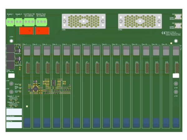 This Termination Board (TB) provides direct connection between the I/O Card of the system and D5000 / D6000 Series modules. The Intrinsically Safe protection and signal isolation between Safe and Hazardous Area, is provided by D5000 Series Associated Apparatus. The 24 Vdc Power Supply of the TB is connected to two plug-in terminal blocks, for a redundant power supply. The power supply for modules is given by TB power bus.