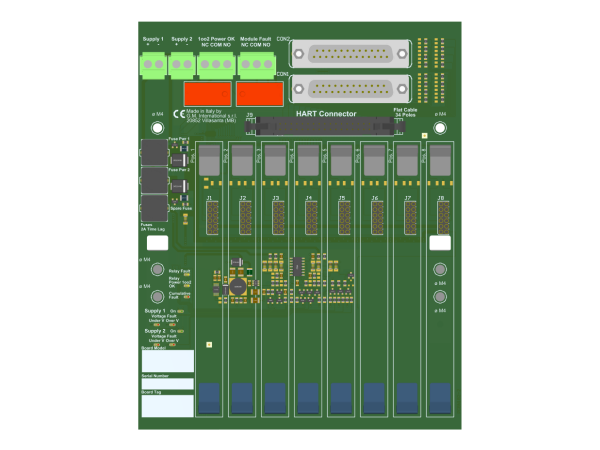 This Termination Board (TB) provides direct connection between the I/O Card of the system and D5000 / D6000 Series modules. The Intrinsically Safe protection and signal isolation between Safe and Hazardous Area, is provided by D5000 Series Associated Apparatus. The 24 Vdc Power Supply of the TB is connected to two plug-in terminal blocks, for a redundant power supply. The power supply for modules is given by TB power bus.