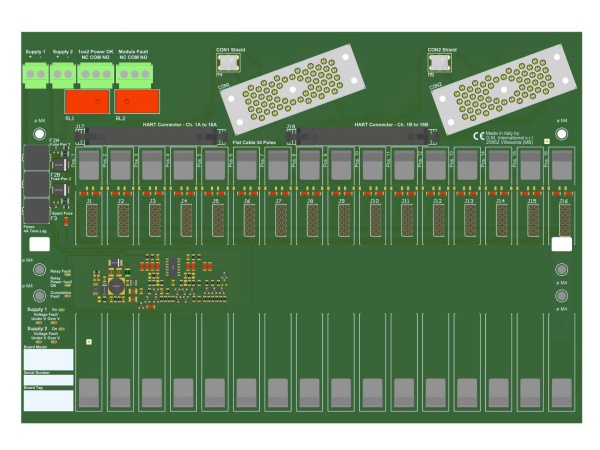 This Termination Board (TB) provides direct connection between the I/O Card of the system and D5000 / D6000 Series modules. The Intrinsically Safe protection and signal isolation between Safe and Hazardous Area, is provided by D5000 Series Associated Apparatus. The 24 Vdc Power Supply of the TB is connected to two plug-in terminal blocks, for a redundant power supply. The power supply for modules is given by TB power bus.