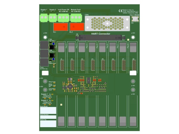 This Termination Board (TB) provides direct connection between the I/O Card of the system and D5000 Series modules. The Intrinsically Safe protection and signal isolation between Safe and Hazardous Area, is provided by D5000 Series Associated Apparatus. The 24 Vdc Power Supply of the TB is connected to two plug-in terminal blocks, for a redundant power supply. In addition, each plug-in terminal block is dual to guarantee a daisy chain connection also when the terminal block is not inserted in the corresponding mating socket connector. The power supply for modules is given by TB power bus.