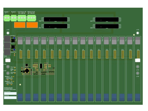 This Termination Board (TB) provides direct connection between the I/O Card of the system and D5000 Series modules. The Intrinsically Safe protection and signal isolation between Safe and Hazardous Area, is provided by D5000 Series Associated Apparatus. The 24 Vdc Power Supply of the TB is connected to two plug-in terminal blocks, for a redundant power supply. The power supply for modules is given by TB power bus.